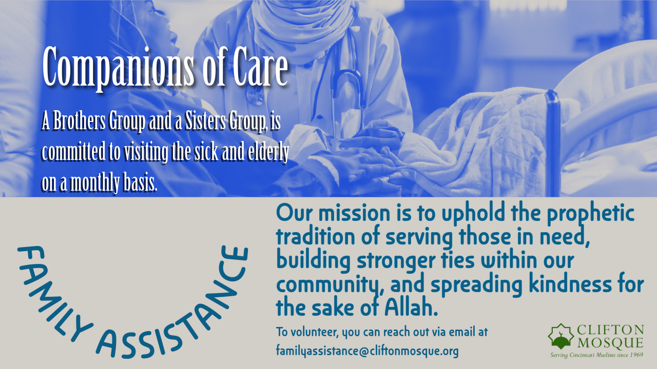 The Family Assistance Committee has two groups, one for brothers and one for sisters, dedicated to visiting the sick and elderly every month. Our mission is to uphold the prophetic tradition of serving the community's needs and spreading kindness for the sake of Allah.