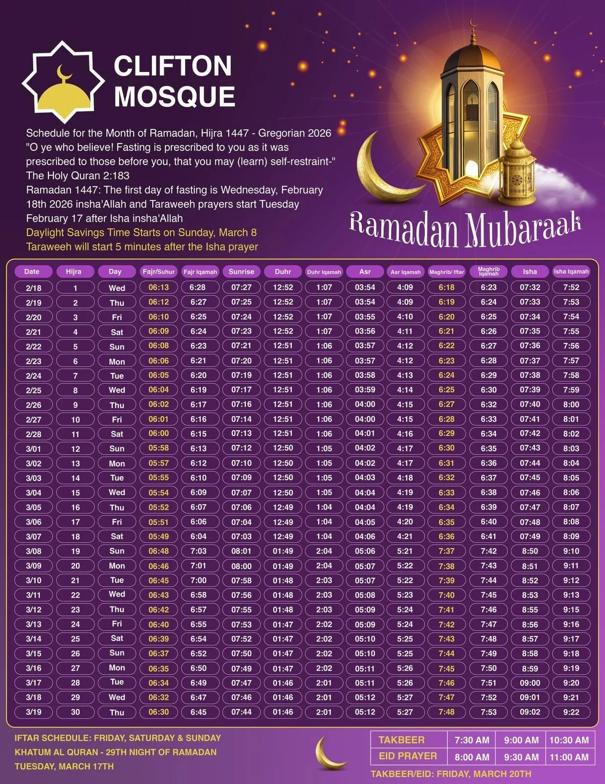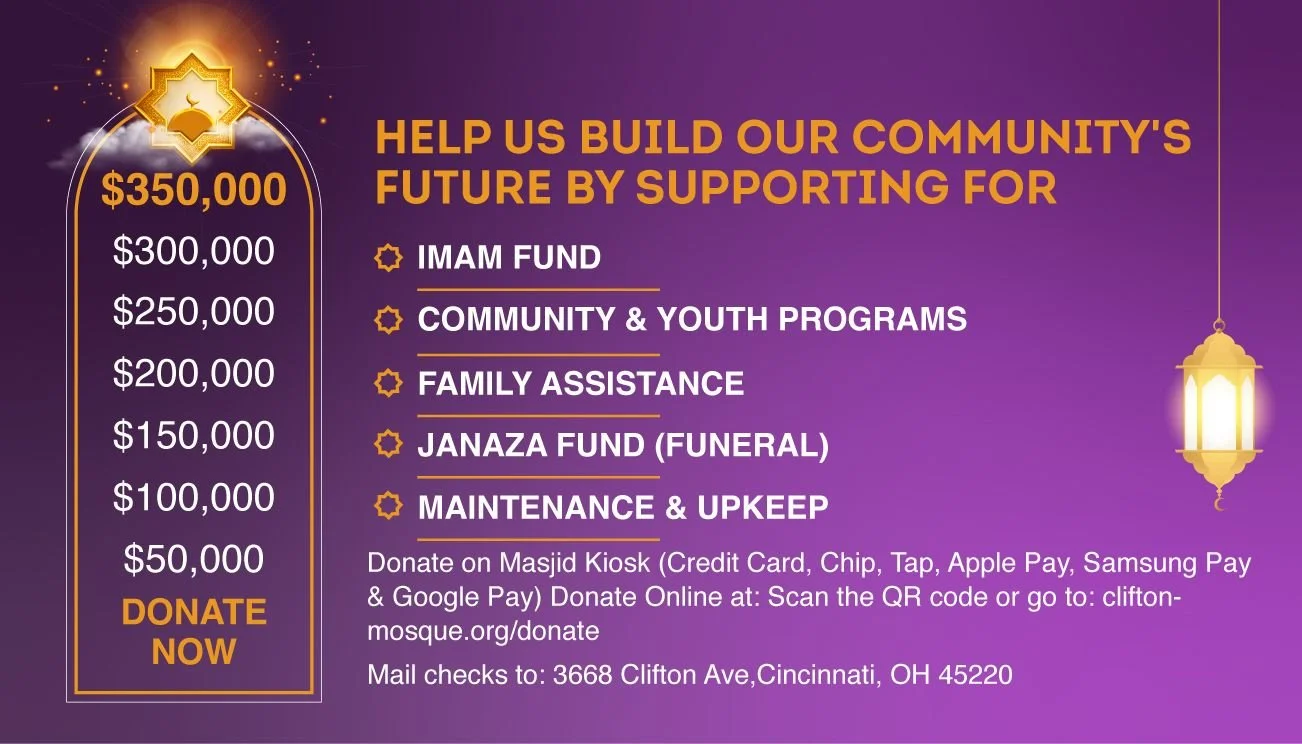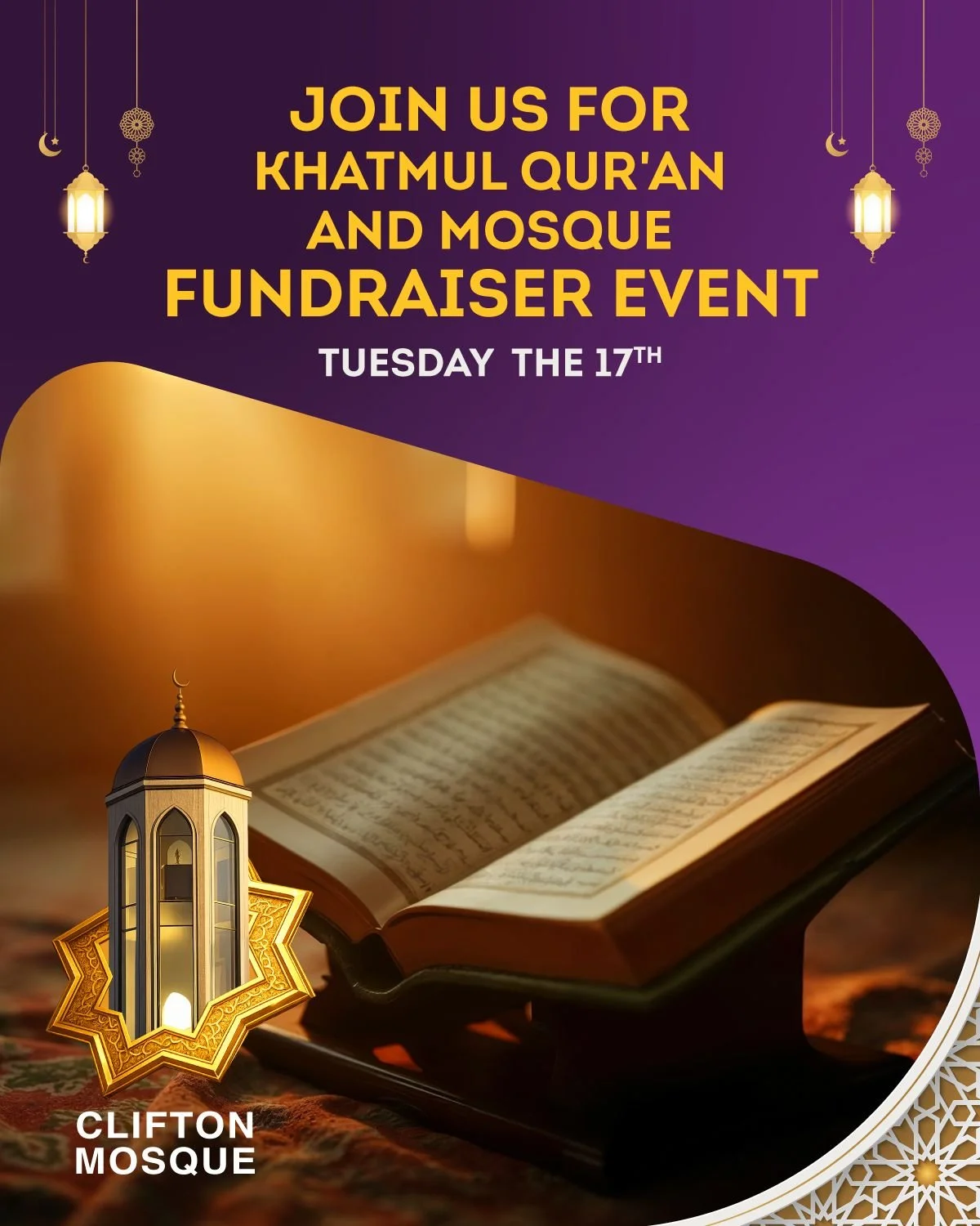 This page is your central hub for everything related to Ramadan at Clifton Mosque; including prayer times, iftar and suhoor arrangements, community events, educational programes, and charitable initiatives. You’ll also find information on how to support the mosque through donations and contribute to our Ramadan efforts.